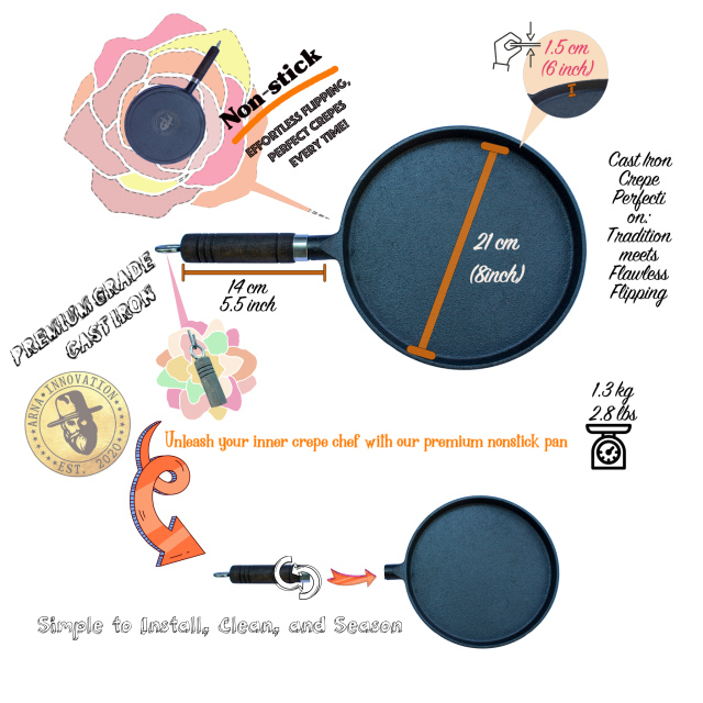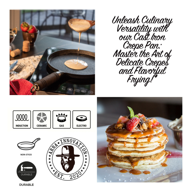 Crafted with durable cast iron, our pan ensures exceptional heat retention for perfectly golden-brown crepes with tender interiors.